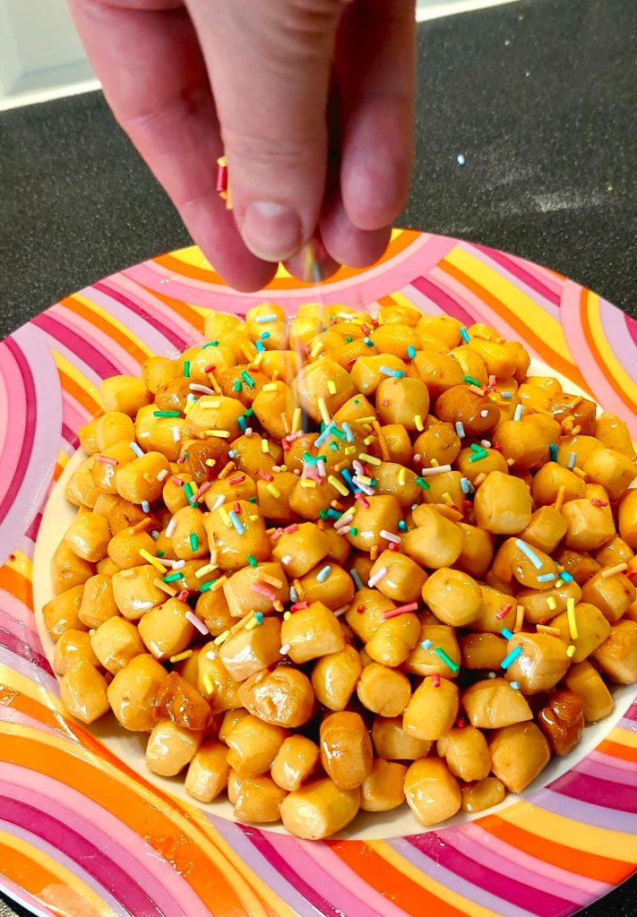 Om het plaatje helemaal compleet te maken, strooi je als laatste wat van de gekleurde sprinkles over de pignolata.