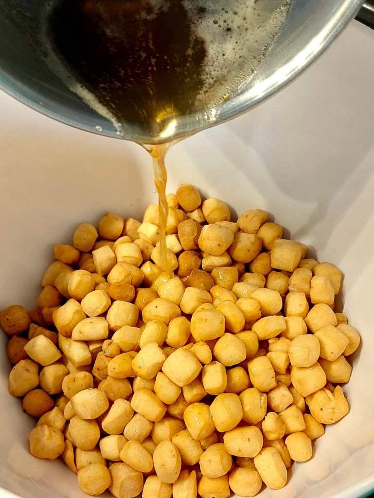 Doe dan de balletjes in een grote kom en giet alle honing erover. Schep ze vlug om zodat alles goed doordrenkt is met de honing.