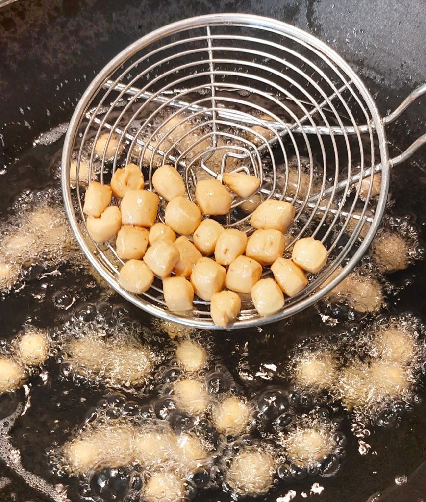 Doe dan beetje bij beetje de balletjes in de olie, niet allemaal te gelijk dus. Bak ze in ongeveer 2 á 3 minuten goudbruin.