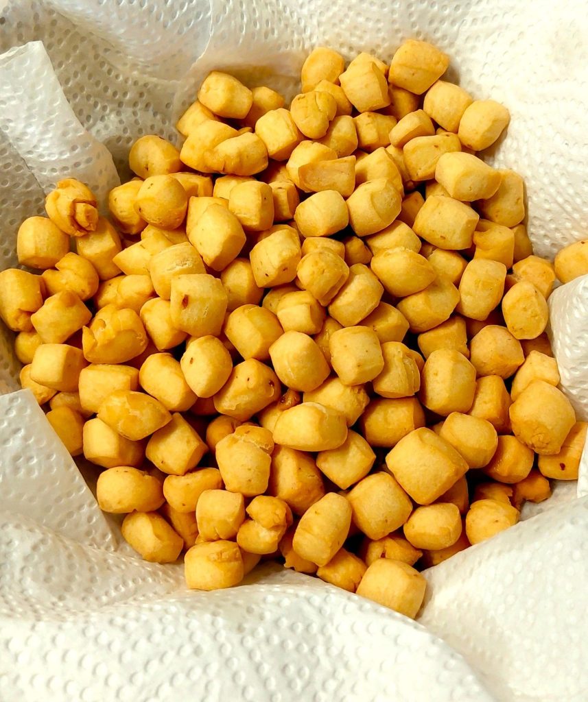 Haal de balletjes met een schuimspaan uit de olie en laat ze goed uitlekken op een plaat bedekt met bakpapier.