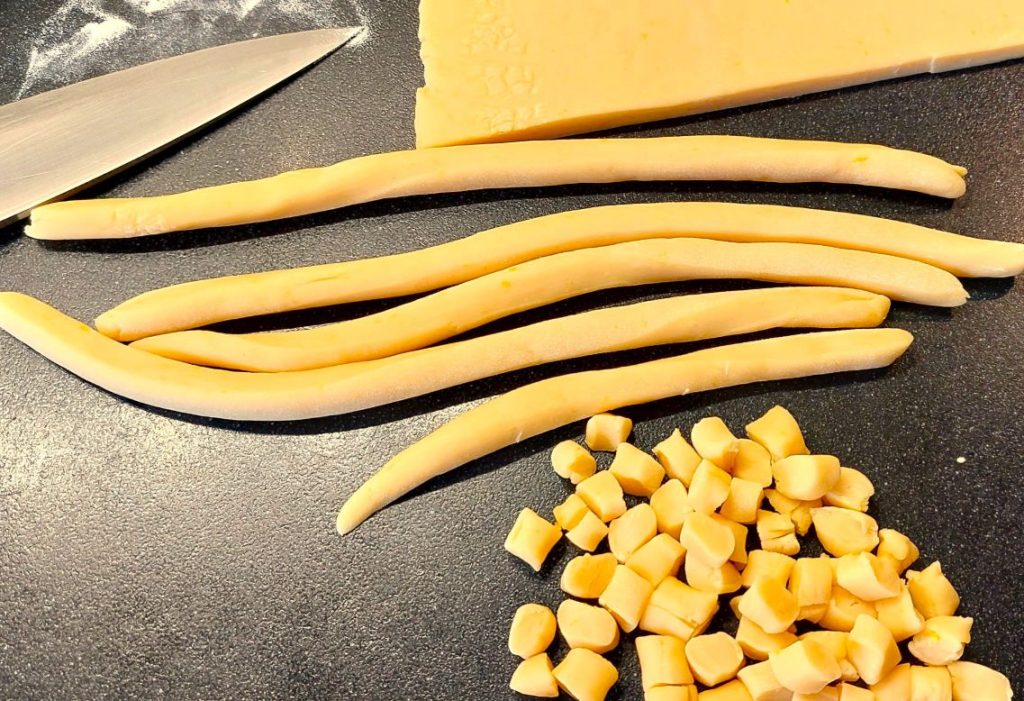 Rol dan “slangetjes” deeg van tussen de 1 en maximaal 2 cm dik. En snij ze dan in kleine stukjes