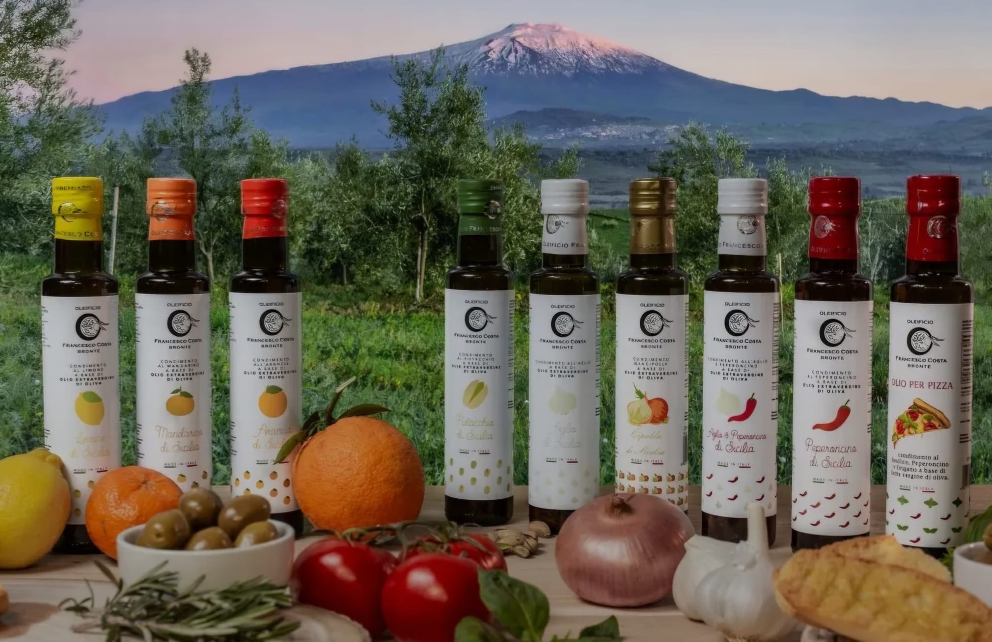 Om deze olijfolie te maken, worden er alleen olijven van geselecteerde herkomst gebruikt samen met de beste grondstoffen. Sinaasappels, citroenen, mandarijnen, chili, oregano, basilicum, rozemarijn, knoflook en uien. Dit alles van hun eigen Siciliaanse land onderaan de Etna.